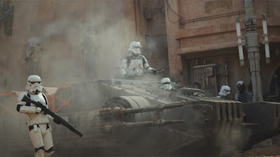 The movie's pacing is also weird, with a first half that's handed over to a lot of "go there, do this" that amounts to pretty much nothing. The screenplay credited to Tony Gilroy and Chris Weitz (yikes) spins its wheels a whole bunch to seem busy, devoting a big chunk of the running time to a mission in which the characters have to locate another character so they can talk him into helping them find another character so he can help them do this other thing; not only are there at least two steps too many here, but it just fails to add up. No new information is offered, the characters don't change. There's time for some additional fan service -- something this movie really doesn't need any more of (are these supposed to be Easter Eggs for Star Wars fans inside the Star Wars movie?) -- but it isn't until the mission proper begins that the movie truly comes to life.
